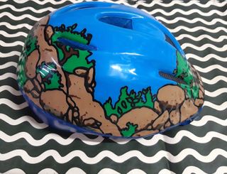 Casco Bici Bell...de los Años 80 Esta algo deteriorado y le faltan las sujecciones...que de estar guardado tantos años..se ha desecho la espuma Tal y como se ve en las fotos Casco de bicicleta Bell de los años 80 con un diseño de paisaje pintado a mano. El casco presenta un cielo azul brillante sobre montañas de tonos tierra y vegetación verde, con un borde inferior azul. - Diseño de paisaje pintado a mano. - Estilo retro de los años 80.