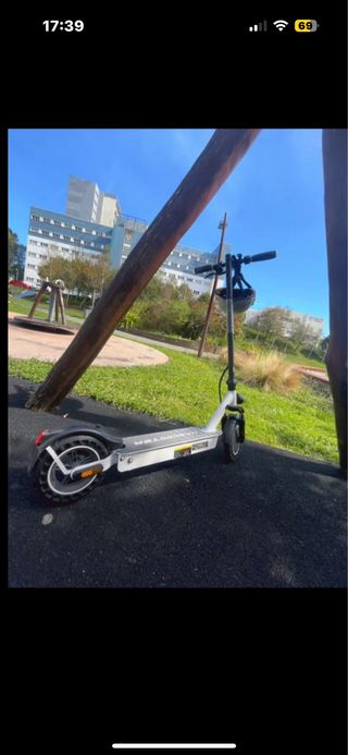 Patinete eléctrico en color blanco, ideal para desplazamientos urbanos. - Diseño moderno y funcional. - Ruedas con buen agarre. - Manillar ajustable.