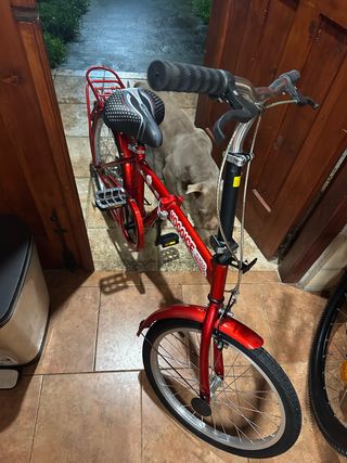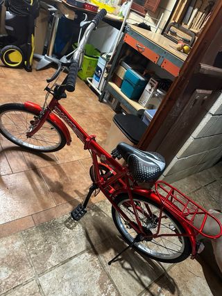 Bicicleta plegable de color rojo, ideal para desplazamientos urbanos. - Cuadro de aluminio. - Ruedas de 20 pulgadas. - Sillín ajustable. - Portabultos trasero. NO SE HA USADO NUNCA