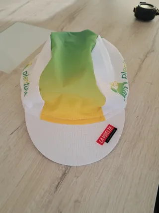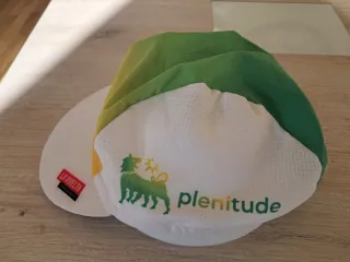 Visera de ciclismo con diseño deportivo y colores vibrantes. - Diseño degradado de verde a amarillo. - Detalle de logo LA VUELTA en la parte frontal. - Detalle de logo PLENITUDE en los laterales - Tejido transpirable y ligero.