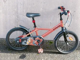 Bicicleta infantil B'TWIN de color naranja, ideal para niños de 4 a 6 años. - Ruedas de 16 pulgadas. - Diseño con personaje. - Frenos adaptados a manos pequeñas.