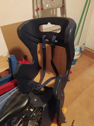 Portabebés para bicicleta en color azul y amarillo, con cinturones de seguridad. Precio negociable. - Asiento acolchado. - Cinturones ajustables. - Estructura de plástico resistente.