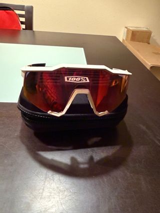 Gafas de sol 100% Speedcraft con lentes rojas y montura blanca. - Diseño deportivo. - Incluye funda protectora.