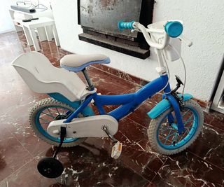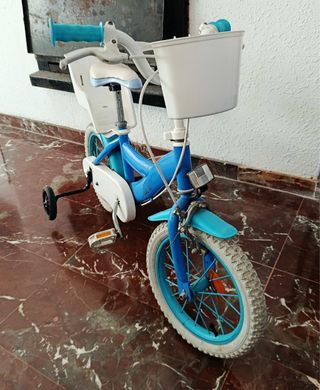 Bicicleta infantil de 14 pulgadas, ideal para los más pequeños. - Color azul con detalles en rosa y amarillo. - Incluye ruedines. - Cesta delantera. - Sillín y respaldo trasero. Está con desgaste pero funcional