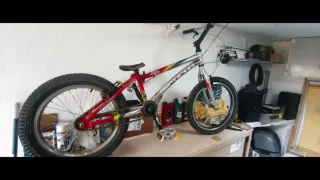 Bicicleta de trial de la marca Monty. - Cuadro de color rojo y plateado. - Ruedas anchas para mayor agarre. - Sillín negro.
