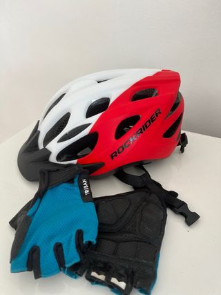 Casco de bicicleta infantil Rockrider en color blanco y rojo. Incluye guantes de ciclismo. - Casco con diseño deportivo. - Guantes de color azul con acolchado negro.