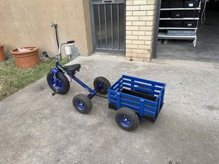 Descripción: Triciclo con remoque infantil procediente de cierre de tienda que estaba en la exposicion. Ideal para dar paseos o para llevar cosas en el remolque. Puede ir por todos los terrenos. Ruedas con cámara de aire. Se puede ir con o sin el remolque.