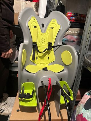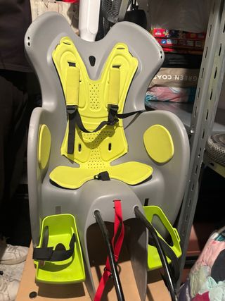 Asiento para bicicleta infantil, marca btwin. Diseñado para la seguridad y comodidad del niño. - Color gris y amarillo. - Cinturón de seguridad de 3 puntos. - Reposapiés ajustables.