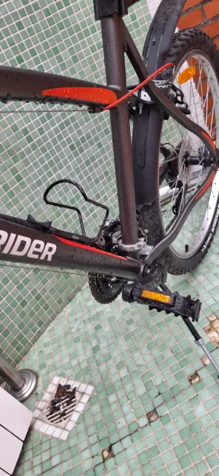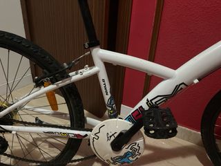 Bicicleta de montaña con ruedas de 26 pulgadas. Pequeños retoques de pintura y freno delantero no vale,de ahí ruedas y gomas buenas cambios Buenos. - Cuadro de color negro. - Horquilla delantera blanca. - Sillín negro. - Reflectores naranjas en las ruedas.