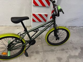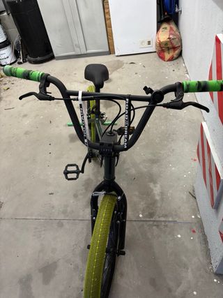 Bicicleta BMX de color verde con detalles llamativos. - Ruedas de color amarillo brillante. - Puños de manillar verdes. - Pedales negros. Posapies incluidos Precio negociable