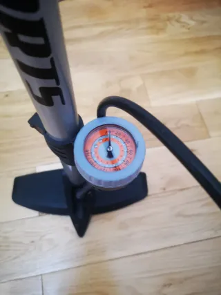 Bomba de aire de pie para bicicletas, con manómetro integrado. - Base estable para un uso cómodo. - Mango ergonómico. - Manguera flexible.