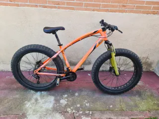 Fat Bike en color naranja, lista para rodar tras una revisión completa. - Ruedas anchas para todo tipo de terrenos. - Cuadro robusto. - Frenos de disco.