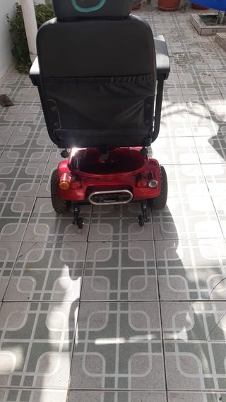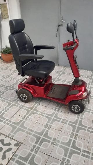 Scooter eléctrico de tres ruedas en color rojo brillante. Cuenta con un asiento acolchado y reposabrazos para mayor comodidad. - Asiento giratorio. - Manillar ajustable. - Ruedas todoterreno.