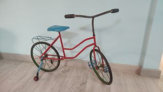 Bicicleta pequeña muy antigua para niño. Desconozco de que década debe ser, pero calculo que andará por la ronda de un siglo. La bici ha sido repintada y le falta un ruedín. Perfecta para decorar algún rincón de la casa. Medidas: Largo 82 cms Altura hasta el manillar 60 cms Altura hasta el sillín 47 cms