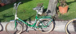 Bici alemana marca Solist, plegable del año 1969, en muy buen estado. Sillin con altura al suelo de 70 a 90 cm según ajuste y con muelles. Freno de tambor trasero y de zapatas delantero. Guardabarros de aluminio, porta cosas trasero de acero inoxidable, cámaras nuevas. Medidas aproximadas sin plegar. Ruedas 20 x 175. Tiene pata de cabra de aluminio. Recoger en mano.