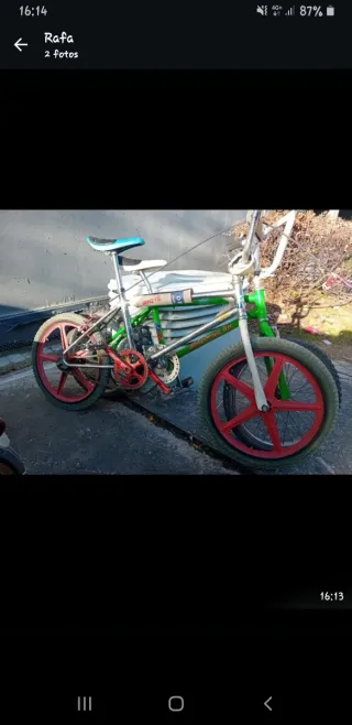 Bicicleta BMX de estilo retro, Pedal derecho con holgura y marcas de desgaste en general tal y como se ve en las fotos Orbea Dakar ideal para coleccionistas o para darle un toque vintage a tus paseos. Sillin spider Puente Frenos olimpic balon aluminio Manetas frenos olimpic 68 aluminio - Cuadro blanco y verde. - Ruedas de color rojo. - Sillín blanco y negro.