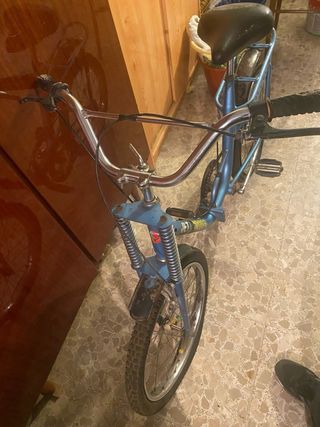 Se vende bicicleta BMX antigua, ideal para coleccionistas o para revivir viejos tiempos. Se encuentra en buen estado de conservación. - Cuadro de metal resistente. - Ruedas con aros rojos. - Sillín azul y blanco.