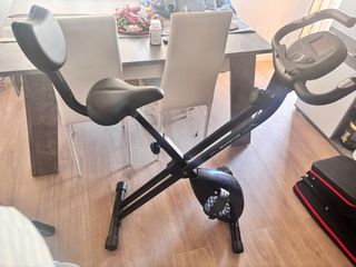 bicicleta estática plegable, modelo Cecotec X-Bike Pro. Diseño compacto y plegable para un fácil almacenamiento. Funcionamiento magnético que proporciona un pedaleo ágil y silencioso (Sistema Silence Fit). Cuenta con un sillín Xtreme Comfort Plus con respaldo y manillar lateral para mayor comodidad y ergonomía. Incluye una pantalla LCD integrada que muestra datos clave como tiempo, velocidad, distancia y calorías consumidas. Soporte para dispositivos electrónicos (tableta o teléfono móvil) integrado en el manillar para hacer el entrenamiento más ameno.