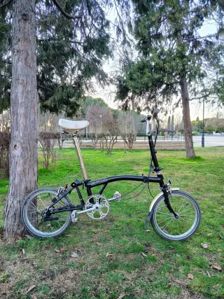 Bicicleta plegable Brompton en color negro. Ideal para desplazamientos urbanos y fácil de almacenar. - Cuadro de diseño clásico. - Ruedas de 16 pulgadas. - Sillín cómodo.