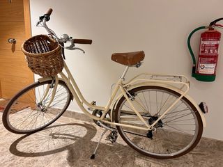 Bicicleta urbana de diseño clásico y elegante, ideal para moverse por la ciudad con comodidad y estilo. Características: • Estilo vintage tipo Berlín • Color crema • Cesta delantera de mimbre • Sillín y puños marrones, cómodos y a juego • Portabultos trasero • Luz delantera y trasera Incluye: • Bomba • Cadena • Cámara de repuesto Estado: muy buen estado, bien cuidada y lista para usar. Perfecta para uso diario, paseos urbanos o para quien busque una bicicleta con estética clásica.