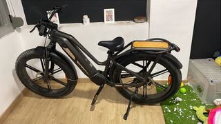 Bicicleta eléctrica con ruedas anchas y diseño robusto. - Color negro mate. - Ruedas tipo fat tire para todo terreno. - Sillín cómodo. - Portaequipajes trasero con detalle de madera. 4 meses de uso está como nueva se puede ver i probar sin problemas