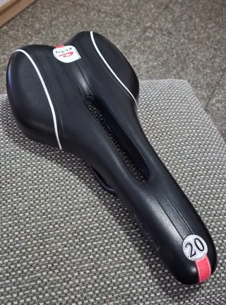 Sillín de bicicleta en color negro con detalles blancos y rojos. - Diseño ergonómico. - Acolchado para mayor comodidad. - Número 20 en la parte trasera.