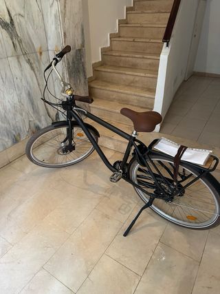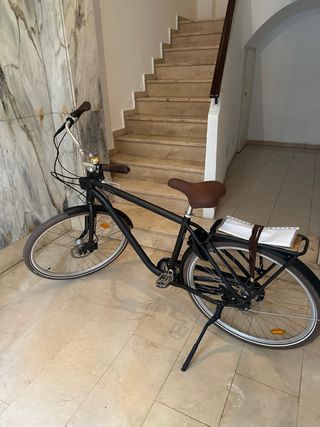 • Bicicleta de paseo/ciudad con cuadro bajo tipo step-through, color negro. • Ruedas grandes con cubiertas lisas para uso urbano y guardabarros delantero y trasero. • Portabultos trasero para alforjas o cesta y pata de cabra estable. • Frenos V-brake, cambio trasero (6 marchas) y timbre en el manillar. • Catadióptricos en ruedas y pedales, luz trasera y sillín cómodo. • Uso ocasional, siempre guardada en interior; funciona todo correctamente.