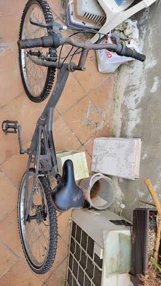 Bicicleta de montaña, tiene las dos ruedas pinchas, la cadena un poco osidada y el sillin un poco desgarrado - Cuadro de aluminio. - Suspensión delantera. - Frenos de discos