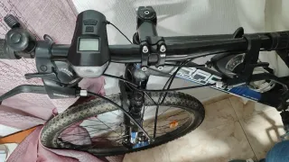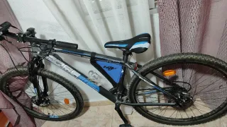 Bicicleta de montaña con doble suspensión en color azul. - Cuadro de aluminio. - Ruedas de 26 pulgadas. - Frenos de disco. - Cambio Shimano. Lo que falta es la rueda delantera que esta desinflada y aparte el sillín no es el suyo pero por lo demás esta como nuevo, lo vendo mas que nada porque ahora uso una moto pero antes esta bici me salvaba para cualquier situación. Para el que este interesado que me hable y llegamos a un acuerdo.