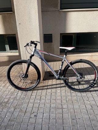 Bicicleta de montaña en color plateado con detalles en rojo y blanco. Ideal para disfrutar de rutas. - Cuadro de aluminio. - Ruedas de 27,5 pulgadas. - Frenos de disco. - Sillín blanco con detalles rojos. cambios altus precio no negociable