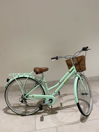 Bicicleta de paseo en color menta, ideal para disfrutar de paseos cómodos. - Cesta delantera de mimbre. - Sillín marrón. - Guardabarros delantero y trasero. - Portabultos trasero.