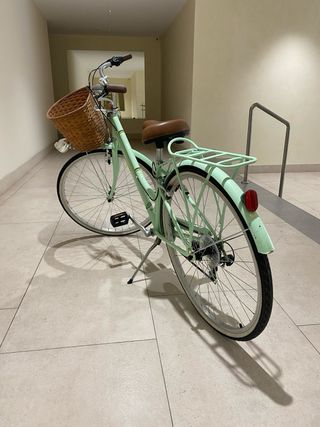Bicicleta de paseo para mujer, modelo Elops, en excelente estado y con muy poco uso. - Color verde azulado. - Cesta delantera. - Portabultos trasero. - Sillín marrón. - Guardabarros.