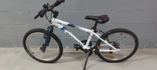 Bicicleta infantil Rockrider en color blanco y azul, ideal para niños de 6 a 9 años. - Cuadro blanco con detalles azules. - Ruedas de 20 pulgadas. - Frenos de mano. - Sillín negro ajustable.