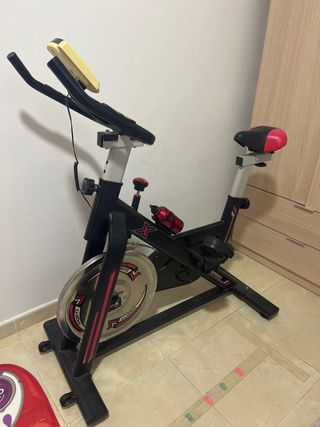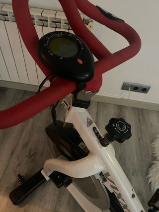 Bicicleta estática de color negro con detalles en rojo. - Manillar con empuñaduras rojas. - Sillín negro. - Pantalla digital en el manillar. - Pedales con correas. Si te gusta llegamos a un acuerdo. No ofertas ridículas.