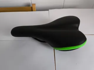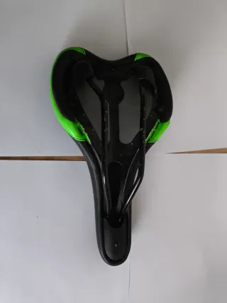Sillín de repuesto para bicicleta estática. Diseño ergonómico y cómodo. - Color negro con detalles en verde. - Material sintético. Con desperfectos en los raíles de la pintura saltada