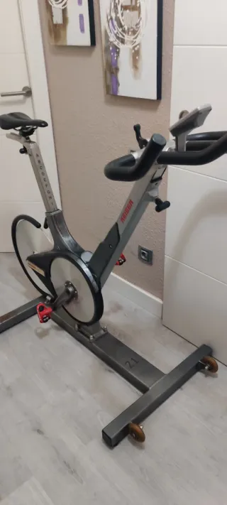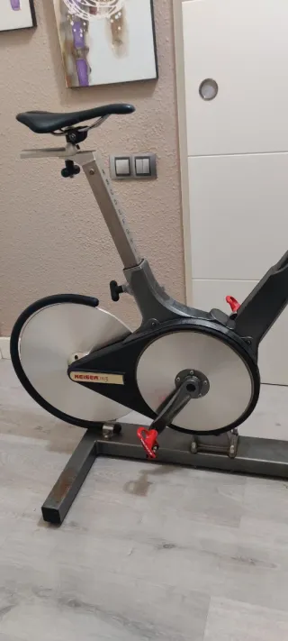 Bicicleta magnética de spinning Kaiser M3. - Diseño robusto y estable. - Sillín carretera y original - Pedales carretera y originales. - trabajada pero en perfectas condiciones - adaptada para entrenamiento con velocímetro GPS y poder cargar tus Km en tu App de seguimiento
