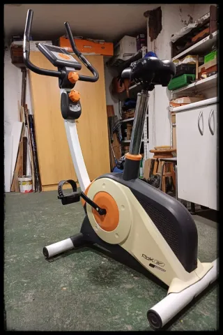 Bicicleta estática en buenas condiciones. - Diseño moderno en gris y naranja. - Sillín acolchado negro. - Pedales con agarre. - Pantalla digital.