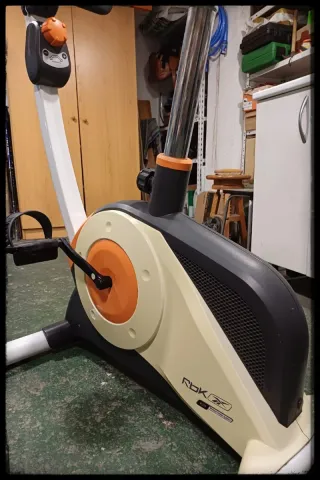 Bicicleta estática de la marca Reebok, ideal para entrenamientos en casa. Su diseño combina colores blanco, naranja y negro. Resistencia ajustable: Dispone de una rueda manual para regular la intensidad del entrenamiento (niveles de resistencia magnética). Consola LCD: Pantalla que muestra velocidad, tiempo, distancia y calorías (funciona a pilas o adaptador, según el modelo exacto). Ajuste de sillín: El sillín es regulable en altura para adaptarse a diferentes usuarios. Manillar ergonómico: Con sensores de pulso integrados para medir la frecuencia cardíaca durante el ejercicio. EL SILLIN TIENE UN PEQUEÑO CORTE
