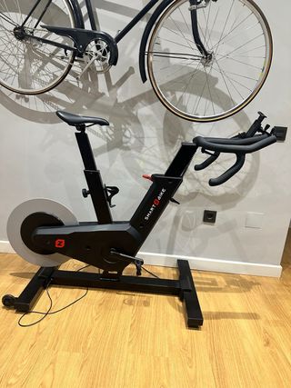 Bicicleta estática SmartBike Bladez BR100 (fabricada por BH) en color negro, compatible con apps como Zwift, Kinomap y TrainerRoad. -Manillar que simula bicicleta de carretera, control de la resistencia con manetas y estructura diseñada para aportar una ligera flexión mientras se pedalea. -La resistencia se regula a través de un sistema de freno magnético; transmisión a través de correa. -Anillo led que cambia el color según intensidad. -Sillín regulable en vertical y horizontal. -Manillar de regulación horizontal. -Soporte para móvil y tablet. -Menos de 1 hora de uso -No se envía. Tampoco se aceptan cambios.