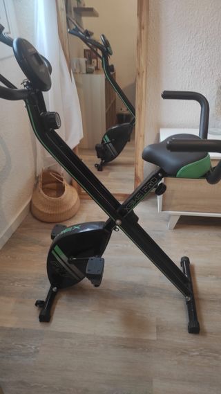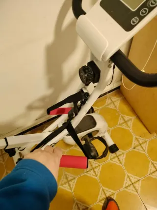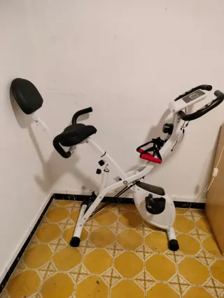 Bicicleta estática plegable, ideal para entrenar en casa. Su diseño permite guardarla fácilmente. **** usada en contadas ocasiones**** ** el sillin tiene alguna imperfeccion pero no afecta para nada** - Estructura blanca. - Asiento y respaldo negros. - Pedales con correas. - Empuñaduras rojas para ejercicios adicionales.