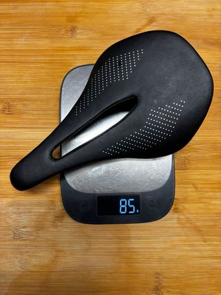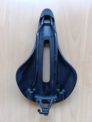 Sillín de ciclismo ultraligero, ideal para carretera y BTT. - Peso: 85 gramos. - Diseño ergonómico con canal central. - Acabado en negro con detalles blancos.