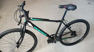 Bicicleta de montaña Wader en color negro con detalles en verde y blanco. - Cuadro robusto. - Ruedas todoterreno. - Sillín deportivo con detalles rosas. - Frenos V-brake. - Monoplato. - Bici impermeable en todos los aspectos, se puede ver y probar sin compromiso alguno.