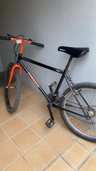 Bicicleta STRONGMAN de montaña clásica. - Cuadro negro. - Ideal para ciudad. - Horquilla y manillar naranjas. - Sillín negro. - Cubiertas seminuevas. - **Tiene la rueda delantera pinchada.