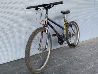 Bicicleta de montaña clásica en color rojo. - Cuadro de metal. - Ruedas todoterreno. - Sillín negro. -Manetas de freno de aluminio - Manillar con puños. -Se da también todos los repuestos que se ven en la fotografía -Porta herramientas triangular en cuadro. -Protector de cambio trasero.