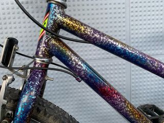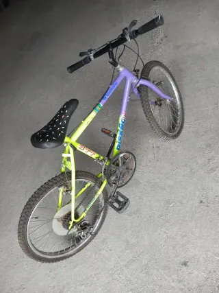 Bicicleta de montaña con un diseño llamativo en morado y verde. - Cuadro de bicicleta de montaña. - Ruedas de bicicleta desinchadas, necesita cambio de ruedas - Sillín negro con estampado.