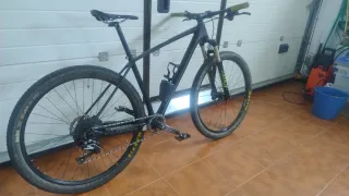 Btt talla entre L y XL, montada con piezas de otras bicis en un cuadro de carbono chino cableado interno. Manillar, sillín y porta bote con herramientas specialized; llanta orbea; horquilla Fox con eje pasante; frenos Shimano; bielas raceface turbine; cambio Shimano slx 10v. Sin holguras. La horquilla funciona pero rezuma aceite. NO NEGOCIABLE. Gracias. Valoro cambio por bici de talla M, para 1,70 aprox.
