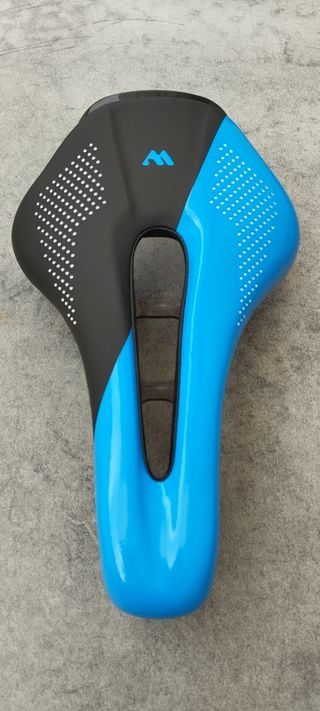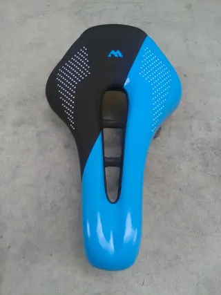 Sillín de gel antiprostatico de la marca NCM para bicicleta. - Color negro con detalle azul. - Superficie con pequeños puntos para mayor agarre. - Diseño ergonómico con canal central. Solo tiene una rascada en la parte de abajo.