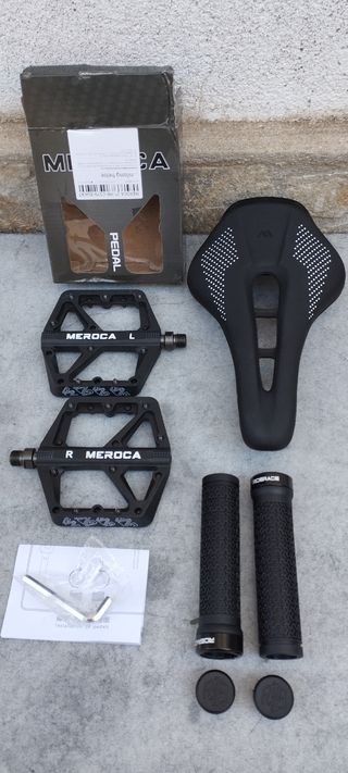 artículo nuevo a estrenar. deja tu bicicleta super guapa con este juego que te ofrezco. se compone de lo siguiente: - sillín de gel WEST BIKING en color negro y con canal antiprostatico. - pedales de plataforma MEROCA con pines intercambiables. sujetan muy bien. - puños RIDERACE con abrazadera y logotipo de la marca en el tapón. más artículos en mi perfil. taller resucitabicis.