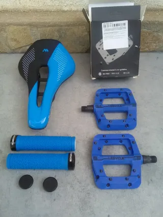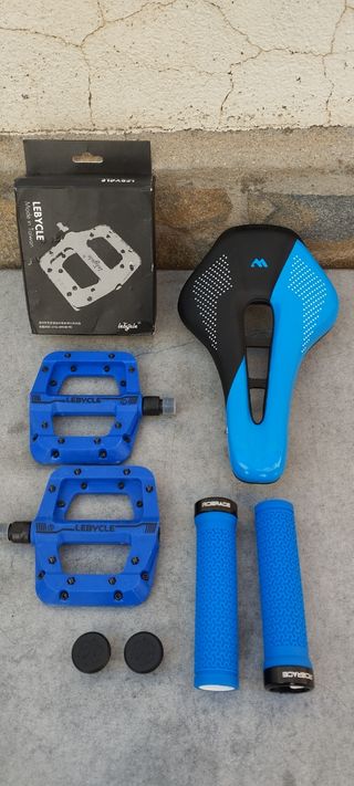 artículo nuevo a estrenar. deja tu bicicleta guapa con este juego que te ofrezco. se compone de lo siguiente: - puños RIDERACE con abrazadera y logotipo de la marca en el tapón. - pedales LEBICLE de plataforma con pines intercambiables. - sillín WEST BIKING de gel bicolor negro/azul con canal antiprostático. mas artículos en mi perfil.