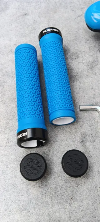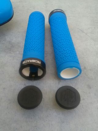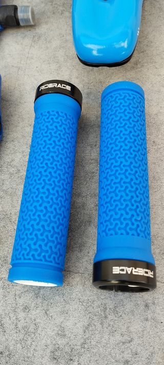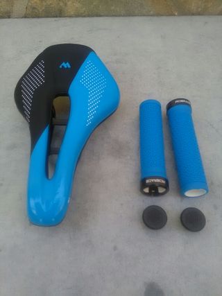 artículo nuevo a estrenar. juego compuesto por: - sillín de gel con canal antiprostatico y sistema de espuma siliconada memory foam que le otorga una comodidad increíble. motivos azules - puños azules de goma RIDERACE con abrazadera y logotipo de la marca en el tapón. el juego esta disponible también en rojo. más artículos en mi perfil. taller resucitabicis.